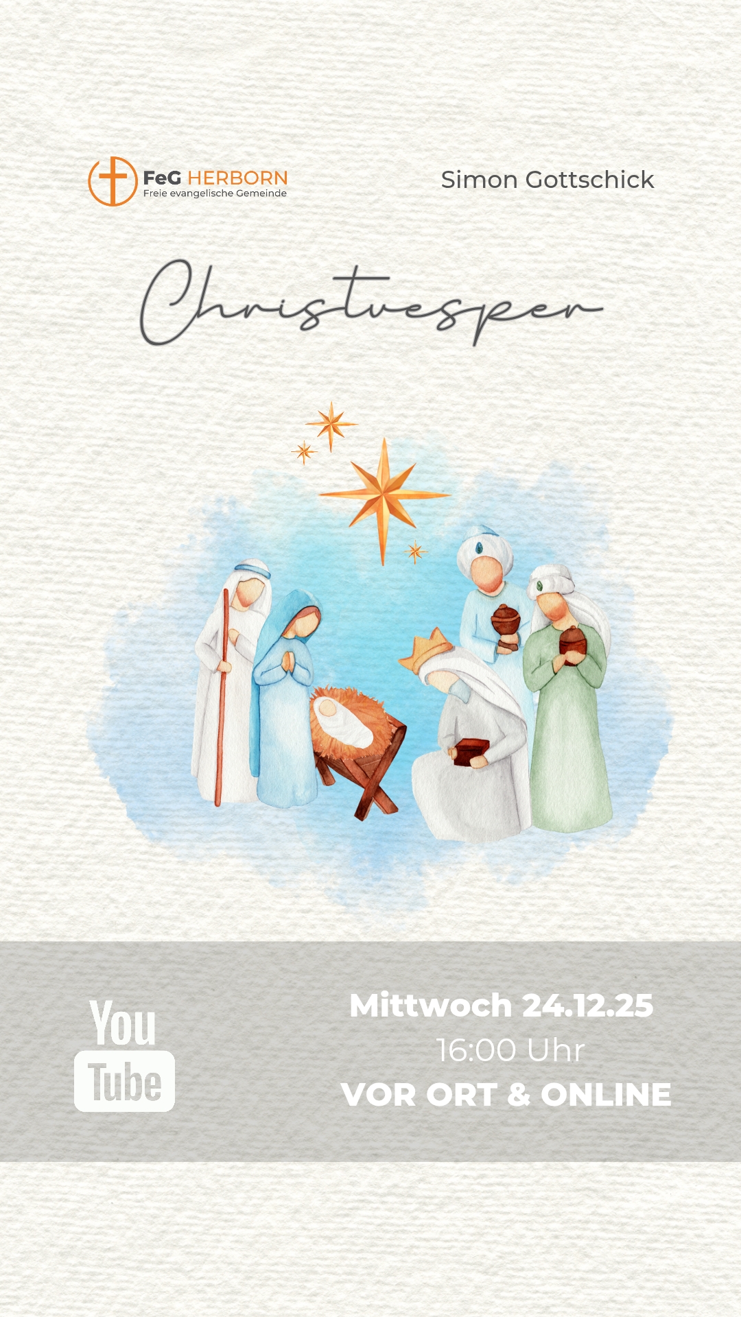 Bitte beachtet, dass zu besonderen Anlässen aus bildrechtlichen Gründen kein Livestream erfolgt. So beispielsweise beim Weihnachtsgottesdienst der Bibelkids. Ein Link für den Stream kann über pastor@feg-herborn.de angefordert werden.
